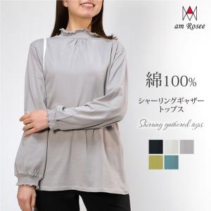 レディース プルオーバー カットソー ギャザー メロウ インナー 長袖 トップス ハイネック ギャザー コットン 綿100% シャーリング 定番