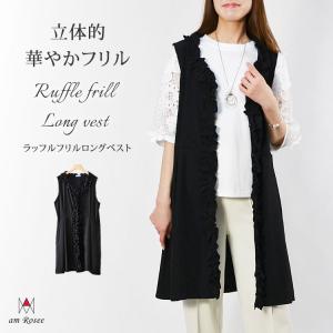 ラッフル フリル ロング ベスト レディース アウター ジレ 黒 羽織 ノースリーブ レイヤード 体型カバー 春 夏 秋 aライン vネック きれいめ