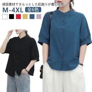 ブラウス 半袖 綿麻シャツ 綿麻シャツ バンドカラー 夏 無地 スタンドカラー トップス 綿混 シャツブラウス レディース シャツ 大きいサイズ 白