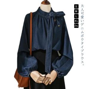 秋 デニムブラウス ボウタイブラウス ブラウス 春 レデイーズ リボン ボリューム袖 デニムトップス デニムシャツ ボウタイ シャツ プルオーバー ボ