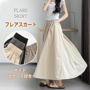 フレアスカート ロングスカート ミモレスカート レディース ハイウエスト ウエストゴム 着痩せ Aライン 体型カバー 脚長効果 春 夏 秋 無 爆買
