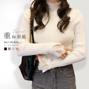 【2点目30%OFF】ニット 袖レース ハイネックトップス 長袖 レディース 重ね着風 フレア袖 レースニット カットソー リブニット フリルネック 冬 爆買