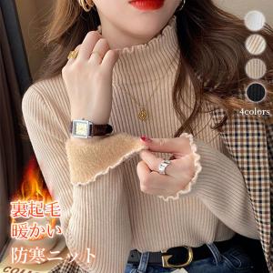 裏起毛 ニット トップス レディース フリルネック ミドルネック セーター モックネック 裏ボア 秋冬 長袖 オフィス カジュアル 暖か 防寒 爆買