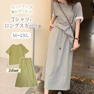 セットアップ レディース Tシャツ スカート ルームウェア 半袖 ロングスカート カジュアル 可愛い ゆったり 上下セット 無地 シンプル 爆買