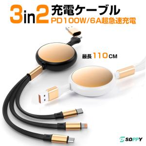 1,580円→1,280円4時間限定】充電ケーブル 3イン2 急速充電ケーブル TypeC USB変換プラグ付 巻き取り式 急速 タイプcケーブル マルチケーブル 6A ライトニング