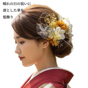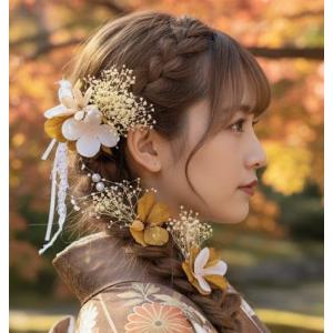 [髪飾りTATA8]成人式 結婚式 卒業式 七五三 前撮り 後撮りかんざし 袴 振袖 留袖 和装 着物 ドレス 高級造花 ドライフラワー水引き 黄色/白/ゴールド 9704h