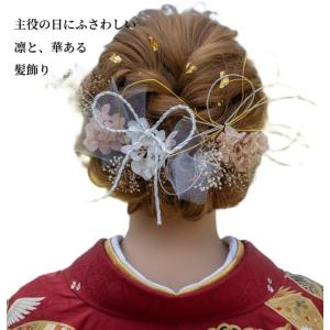[髪飾りTATA8]髪飾り 成人式 卒業式 結婚式 振袖 かんざし ヘッドドレス 和装 着物 ドライフラワー 水引 和紐 チュール 白/ゴールド/シャンパン/シルバー45h