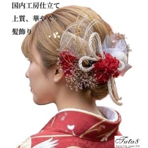 【髪飾りTata8】成人式 振袖 結婚式 卒業式 袴 和装 高級造花 プリザーブドフラワー 金箔 リボン 飾り紐 和玉 パール 水引き(白1/赤/ゴールド/シルバー)74a