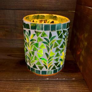 キャンドルホルダー モザイクガラス グリーン リーフ 葉っぱ模様 可愛い オブジェ インテリア