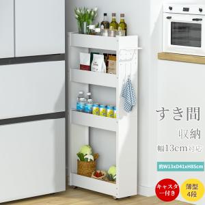 すき間収納 ワゴン 幅13cm スリムトローリー キッチンラック 薄型4段 スチール 調味料 隙間 収納カート 耐荷重約32Kg ハンドル付き・隠しキャスター・フック2個