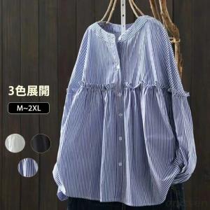 シャツ レディース シャツ ストライプ柄 長袖 森ガール 綿100 フェミニン 切り替え ショート丈 ラウンドネック シャツ