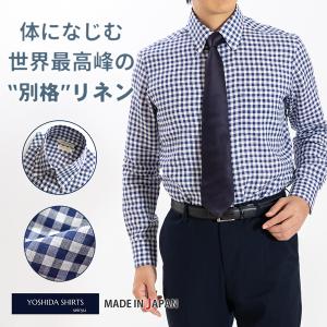 チェックシャツ 長袖 ビジネス カジュアル メンズ 日本製 リネン100% 麻 ハードマンズリネン ボタンダウン ネイビー SNFG26-118