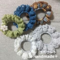 ハンドメイド 編み物 アイボリーとピンクと紫のカラフルフリルシュシュ