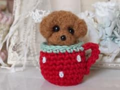 ハンドメイド毛糸ぽんぽん小さなトイプードルクリームカフェオレリボン愛犬置物