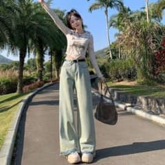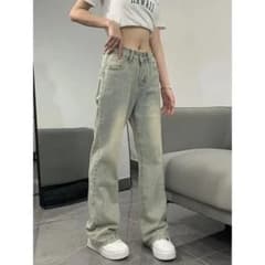 黄泥色毛緣ライトブルーデニムワイドレッグパンツ サイズ:2XL