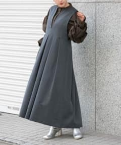 Etam 起毛ノースリーブロングワンピース 肩ボタンフェイク 上品 腰リボン M