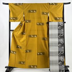 紬 着物 正絹 絣柄 黄色 辛子色 グリーン 着付け お稽古