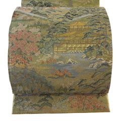 【美品】 丸帯 逸品 京名所 建物 金糸 箔 薄緑 お太鼓柄 正絹 【中古】