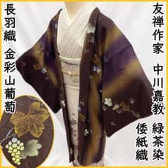 509mc17●友禅作家 中川嘉教 ちぎり和紙友禅 長羽織 山葡萄文様●しつけ付