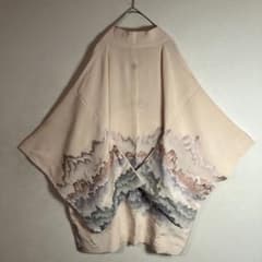 【着物カーディガン】羽織り 総柄 山柄 サーモンピンク 使用感 古着