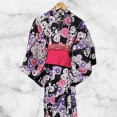 【美品】花柄×黒地 浴衣セット(作り帯・腰紐2本・レース帯付き)フリーサイズ