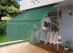 新品 リビングアウト(Living Out) 前幕と物干し竿付きオーニング グリーン 幅203×奥行22~145×高さ200~300cm 幅2m 日よけ アーム伸縮タイプ 目隠し つっぱり式 UVカット 冷房効率アップ タープ角度調整可能 シェード