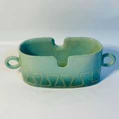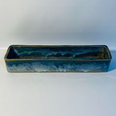 D-壁 昭和レトロ たつみ窯 陶器製 水盤 長鉢 淡いブルー 活け花 盆栽 花瓶