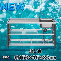 #2565 ステンレス製 流し台 作業用2段シンク 蛇口付き 付属品セット サイズ 約150×45×80cm ※北海道、沖縄本島、沖縄の離島、その他離島へは別途配送料有り