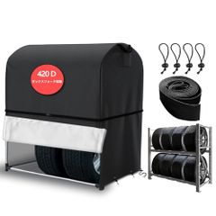 タイヤラックカバー 屋外 防水 ダブルファスナー 420D 厚手 8本収納 タイヤ保管カバー 便利なハンドル 車用収納カバー 紫外線防止 防風 防雨 劣化・汚れ防止 耐久 防風ベルトと収納袋付き ( 長さ110×幅75×高さ145cm, ブラック 420D★m