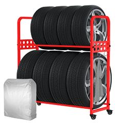 MEICHEPRO タイヤラックセット カバーとキャスター付属 タイヤスタンド 2段式タイヤラック 8本タイヤ収納 耐荷重300kg 幅105.5cm×奥行38cm×高さ106cm (レッド セット)★m
