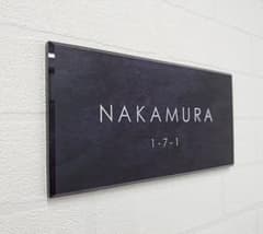 ステンレスブラック調ベースのアクリル表札*4辺45度斜めカット鏡面仕上げUV印刷