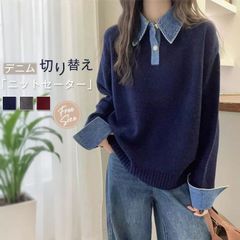 ニット セーター デニム 切り替え ニットセーター レディース 春 秋 冬 長袖 トップス カットソー 異素材切り替え プルオーバー 上着 プル