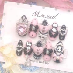 ネイルチップ現品フレンチガーリーちゅるんワンホン韓国地雷痛推しネイル黒メンカラ