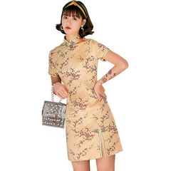[TRTRO] チャイナ服 ミニ チャイナドレス ショート ファッションデザイン チーパウ Qipao 旗袍 サテン 膝上 (梅柄金色, S)