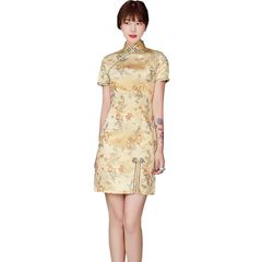 [TRTRO] チャイナ服 ミニ チャイナドレス ショート ファッションデザイン チーパウ Qipao 旗袍 サテン 膝上 (龍鳳柄ゴールド, S)