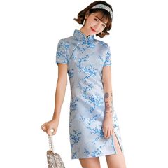 [TRTRO] チャイナ服 ミニ チャイナドレス ショート ファッションデザイン チーパウ Qipao 旗袍 サテン 膝上 (梅柄水色, M)