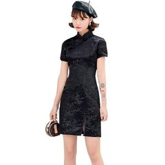 [TRTRO] チャイナ服 ミニ チャイナドレス ショート ファッションデザイン チーパウ Qipao 旗袍 サテン 膝上 (梅柄黒色, XL)