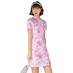 [TRTRO] チャイナ服 ミニ チャイナドレス ショート ファッションデザイン チーパウ Qipao 旗袍 サテン 膝上 (梅柄ピンク, 3XL)