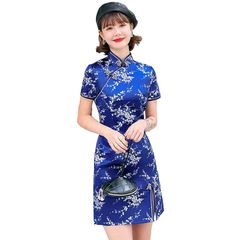 [TRTRO] チャイナ服 ミニ チャイナドレス ショート ファッションデザイン チーパウ Qipao 旗袍 サテン 膝上 (梅柄ブルー, 3XL)