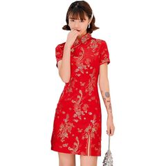 [TRTRO] チャイナ服 ミニ チャイナドレス ショート ファッションデザイン チーパウ Qipao 旗袍 サテン 膝上 (龍鳳柄赤色, M)