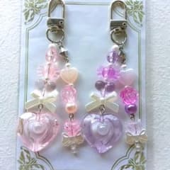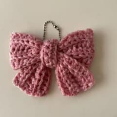 ハンドメイド ピンクのリボンチャーム 編み物 かぎ針編み