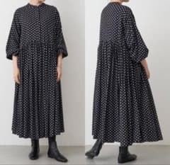 レトロ 水玉 総柄 ワンピース スタンドカラー ぽわん袖 体型カバー 黒 長袖