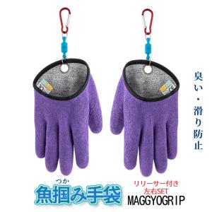 魚用 手袋 フィッシング グローブ 魚 グリップ 魚掴み 両手セット マグネットリリーサー 磁石 滑り 防止 カラビナ パープル 臭い 防止 右手 左手 MAGGYOGRIP