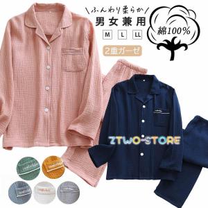 ガーゼ パジャマ ダブルガーゼ 長袖 前開き シャツ メンズ レディース ルームウェア 綿100% 柔らかい 2重ガーゼ 肌触りが良い 上下 可愛い 部屋着 寝間着 M L LL