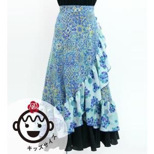 キッズ フラメンコ 巻きスカート アラベスク×花柄 ブルー 120・140サイズ FMSp-4