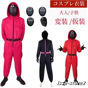 イカゲーム Squid Game 風○△□の警備員 監視員 BOSS コスプレ 衣装 赤いジャンプスーツ 赤い服の人 黒い マスクお面 コスチューム 大人用 子供用