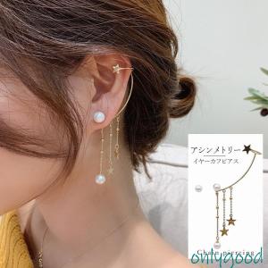 イヤーカフ レディース パール イヤーカフピアス 星モチーフ チェーンピアス アシンメトリー ロング イヤークリップ