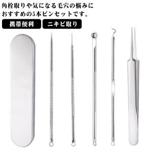 角栓取り 5本セット ニキビ取り 毛抜き 収納ケース付き ピンセット コメドプッシャー ニキビ針 ステンレス 毛穴ケア 鼻ケア 黒ずみ取り 携帯便利