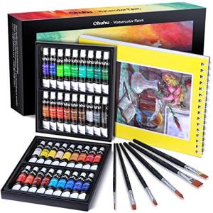 Ohuhu 水彩絵の具セット 36色 6本水彩筆 絵の具 絵具 水彩画セット画材 絵画 透明水彩 白 男の子 女の子 大人 初心者 藍色 12m