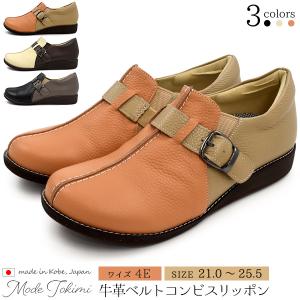 スリッポン レディース 本革 牛革 ベルトコンビ 靴 軽量 日本製 おしゃれ 4E 履きやすい 21.5〜25.5cm 女性 小さい 大きいサイズ